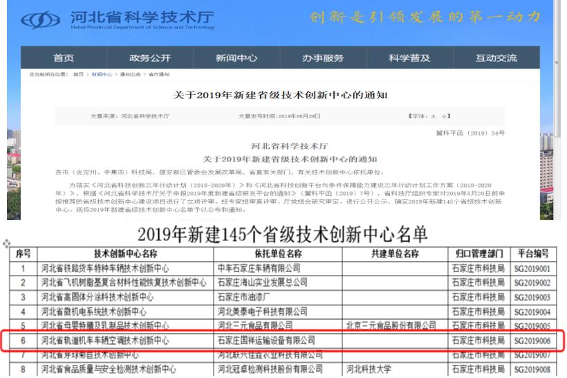 On August 29, 2019, No.34, J.K.P.H [2019] "Notice on Establishment of Provincial Technology Innovation Center in 2019" was issued by Hebei Provincial Department of Science and Technology, and our application for establishement of "Hebei Railway Locomotive Air Conditioning Technology Innovation Center" passed the evaluation and was approved to build.