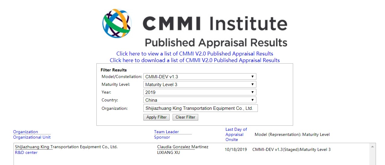 From October 14 to 18, 2019, after strict review and evaluation by Claudia Gonzalez Martinez, the chief appraiser, and the appraisal team, Shijiazhuang King Transportation Equipment Co., Ltd. successfully passed the CMMI-3 review executed by the audit of the U.S. CMMI Research Institute after the online publication of the results on October 18, 2019.
